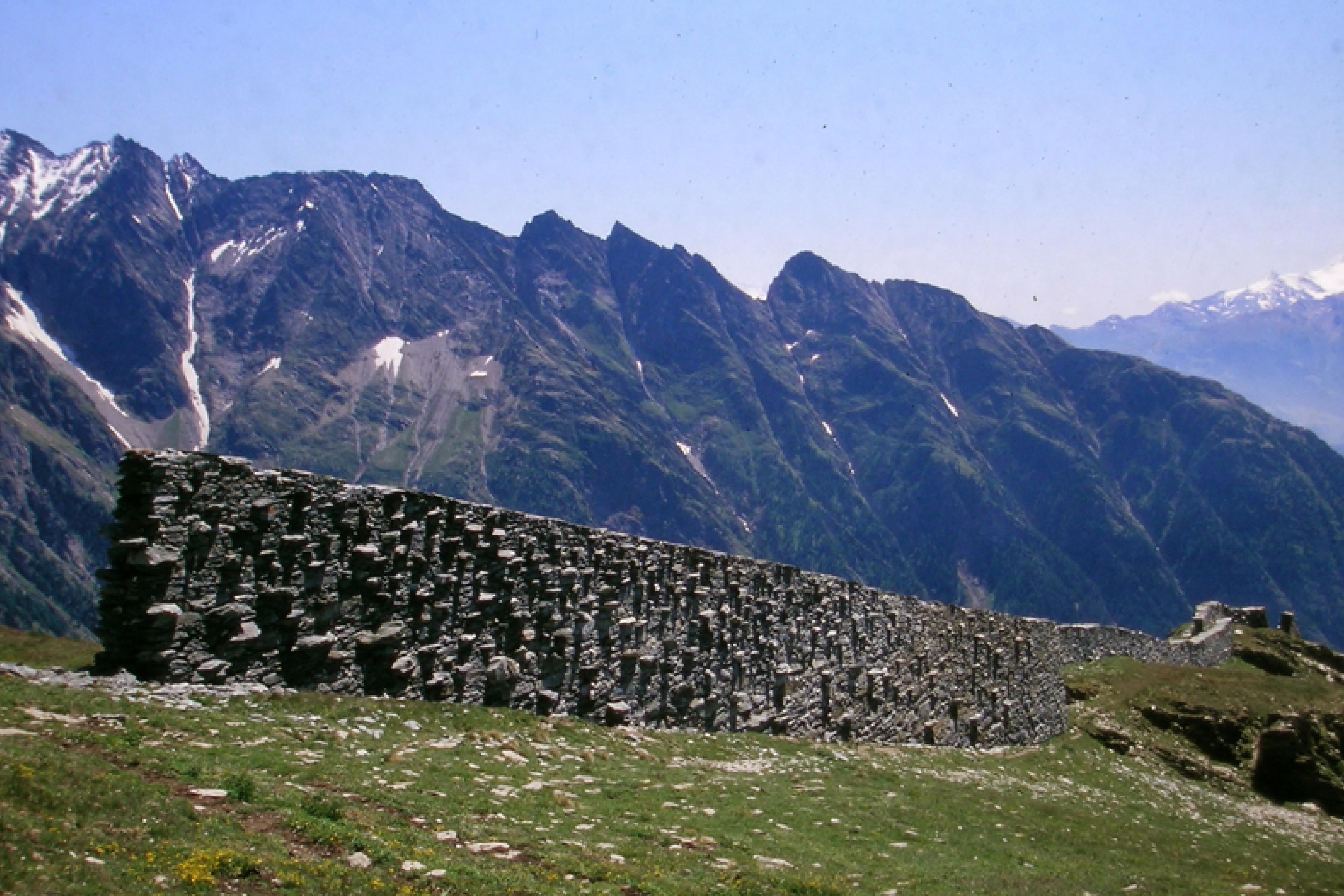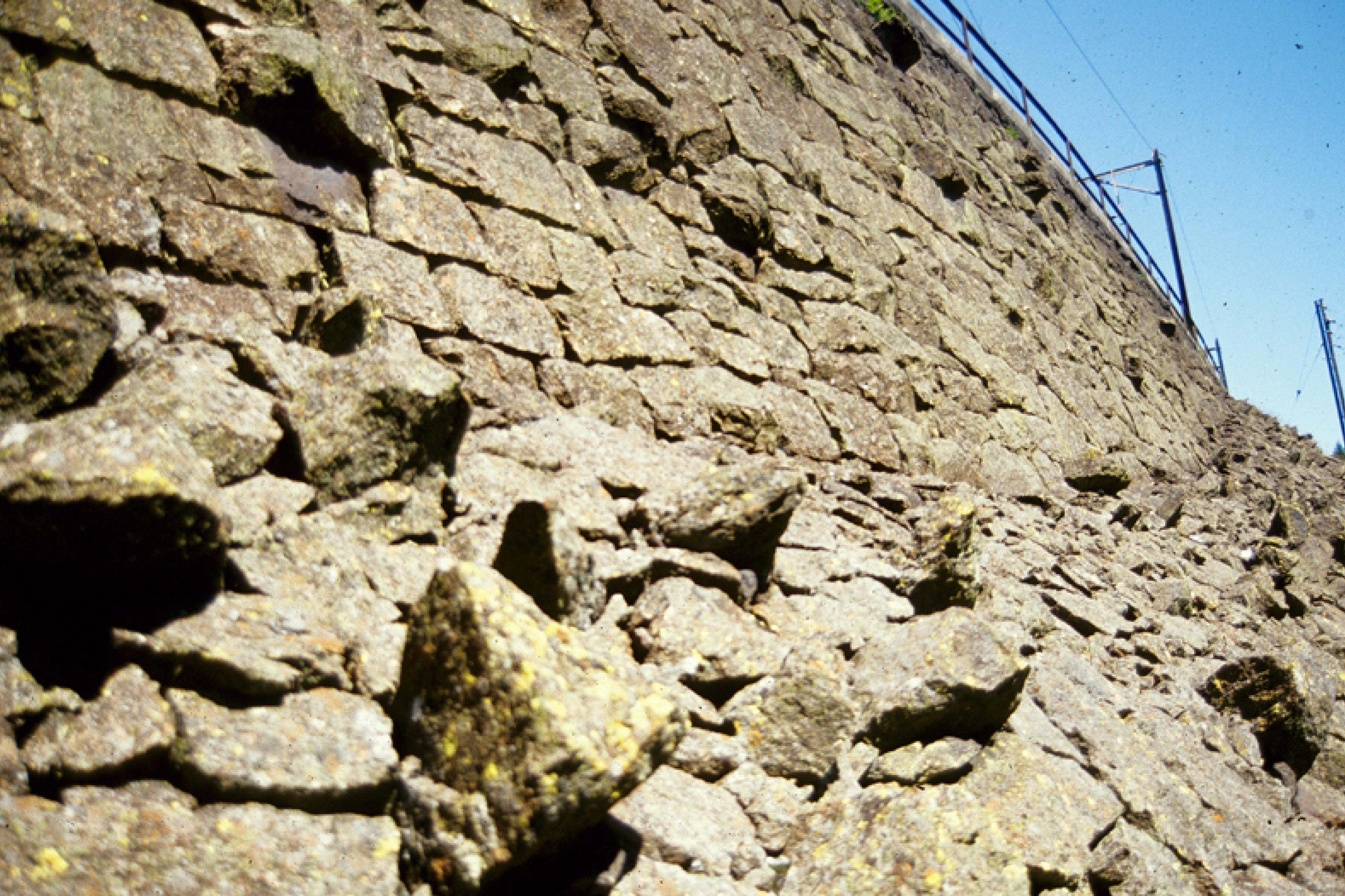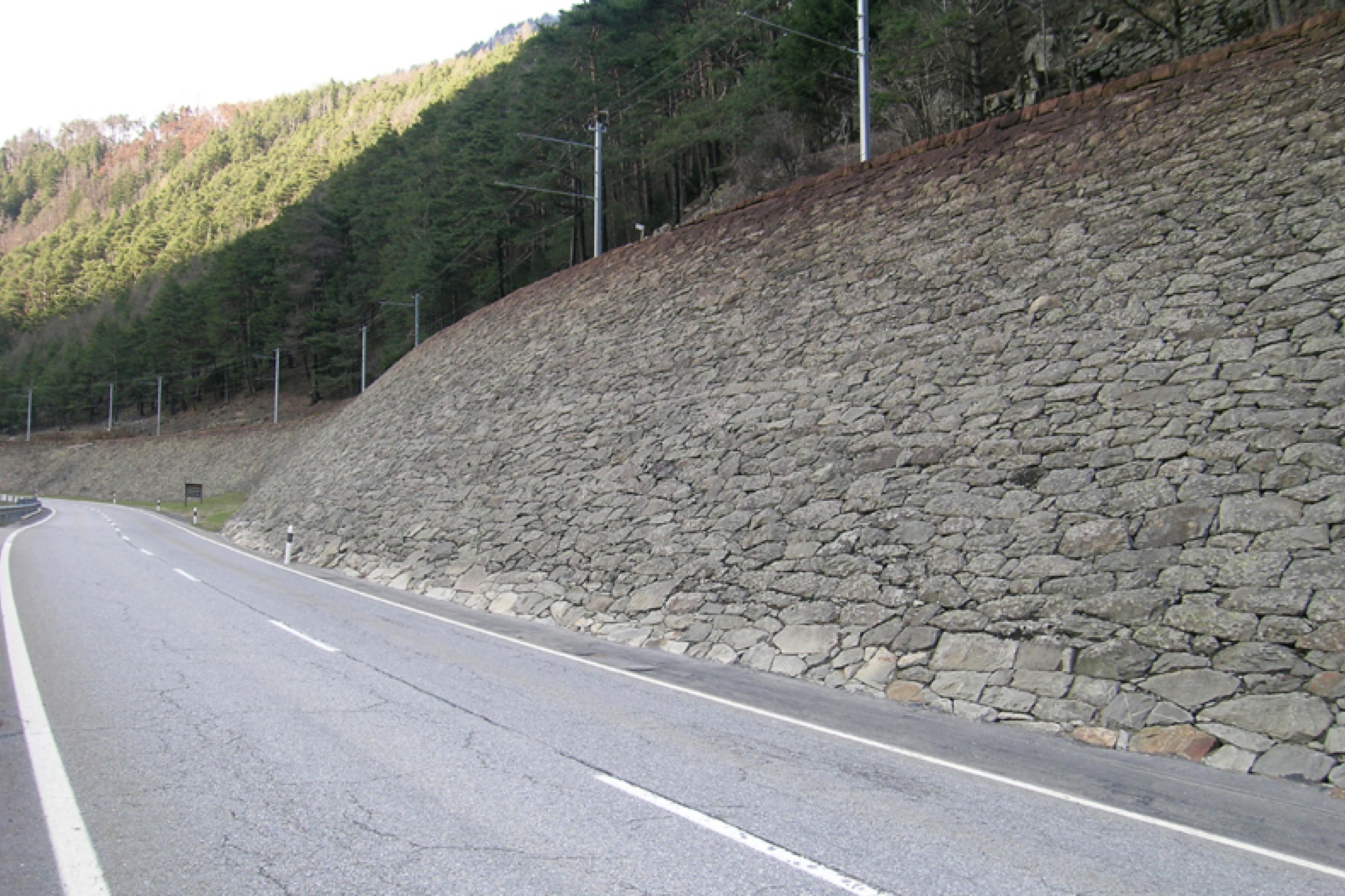 These drystone structures date from the end of the 19th century, when new, larger roads were built across the Alps in the course of the industrial revolution, and shortly afterwards also railways. Because cement and concrete had only just been invented and transport was almost impossible in the difficult-to-access terrain, people were dependent on using the stone available on site as a building material. The numerous retaining walls that were necessary for the construction of the road and railway routes were built as natural stone walls, often as mortar masonry, but where possible also as dry masonry.