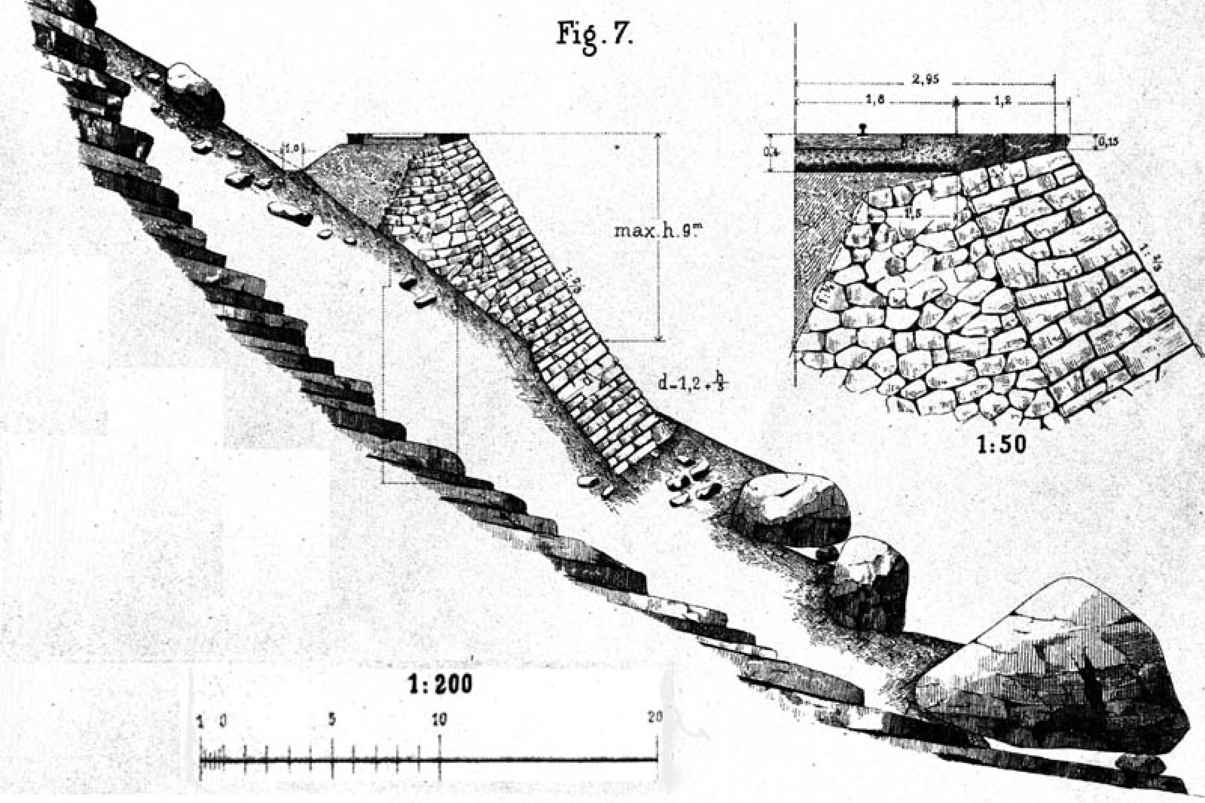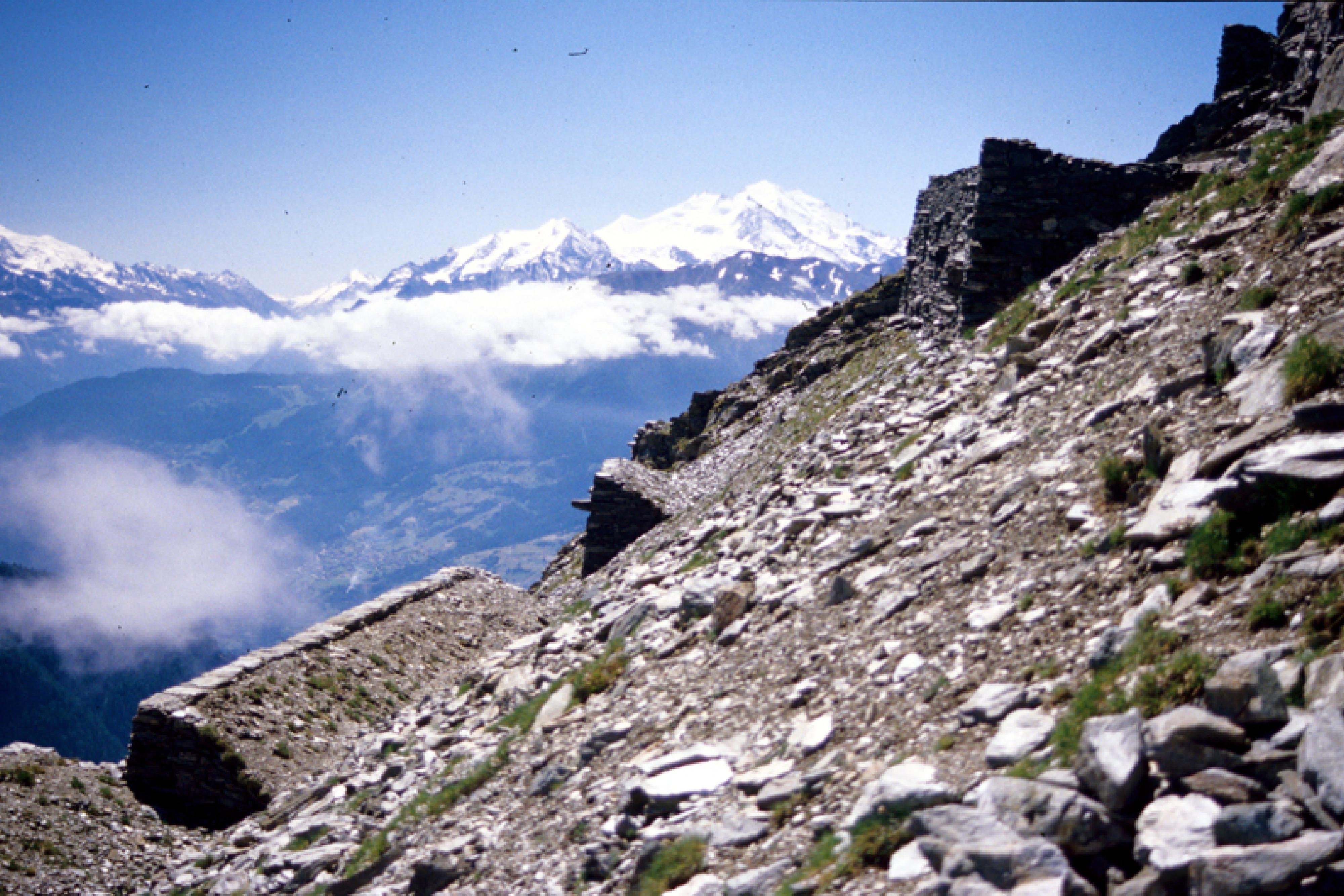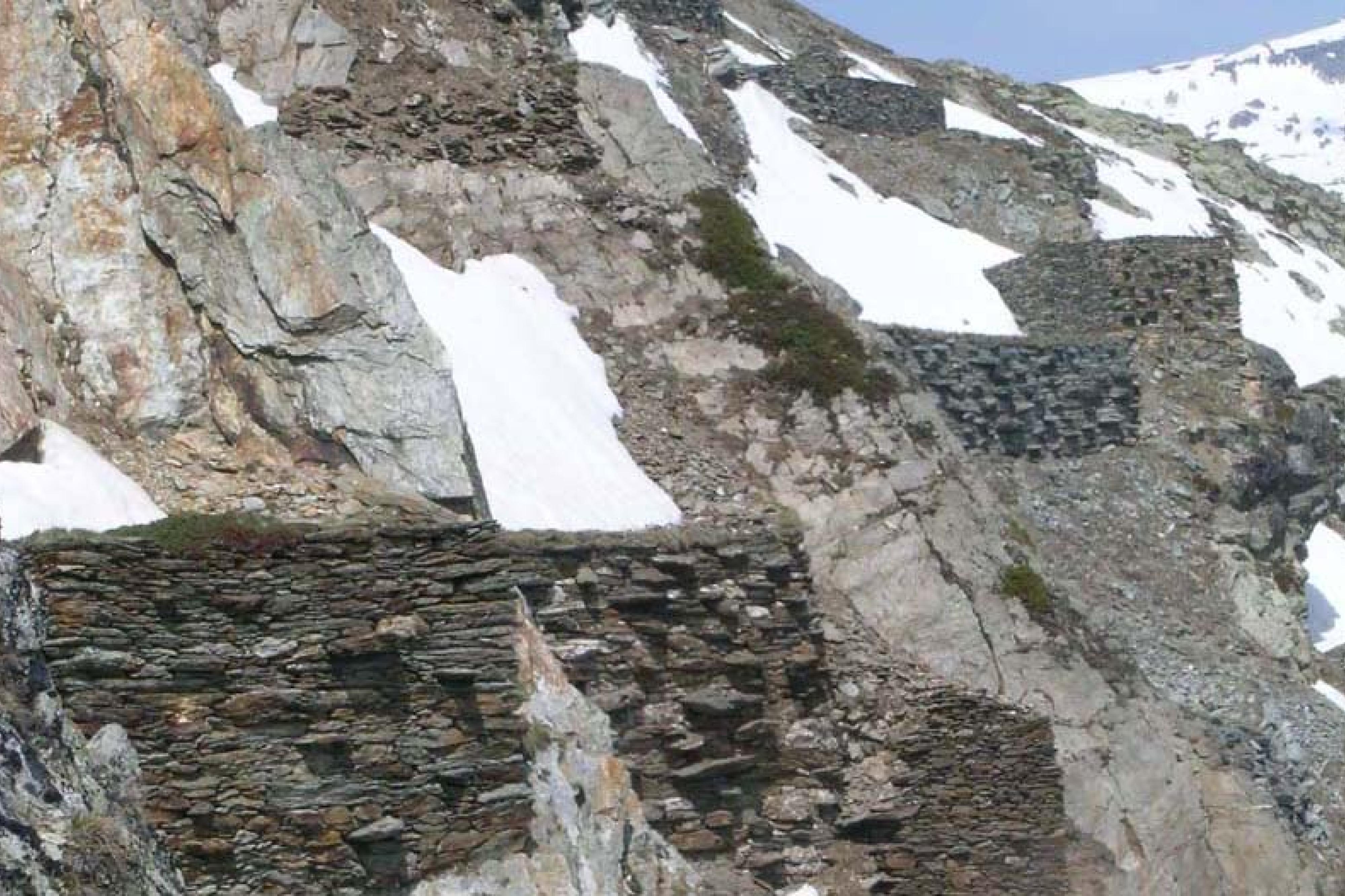 These drystone structures date from the end of the 19th century, when new, larger roads were built across the Alps in the course of the industrial revolution, and shortly afterwards also railways. Because cement and concrete had only just been invented and transport was almost impossible in the difficult-to-access terrain, people were dependent on using the stone available on site as a building material. The numerous retaining walls that were necessary for the construction of the road and railway routes were built as natural stone walls, often as mortar masonry, but where possible also as dry masonry.