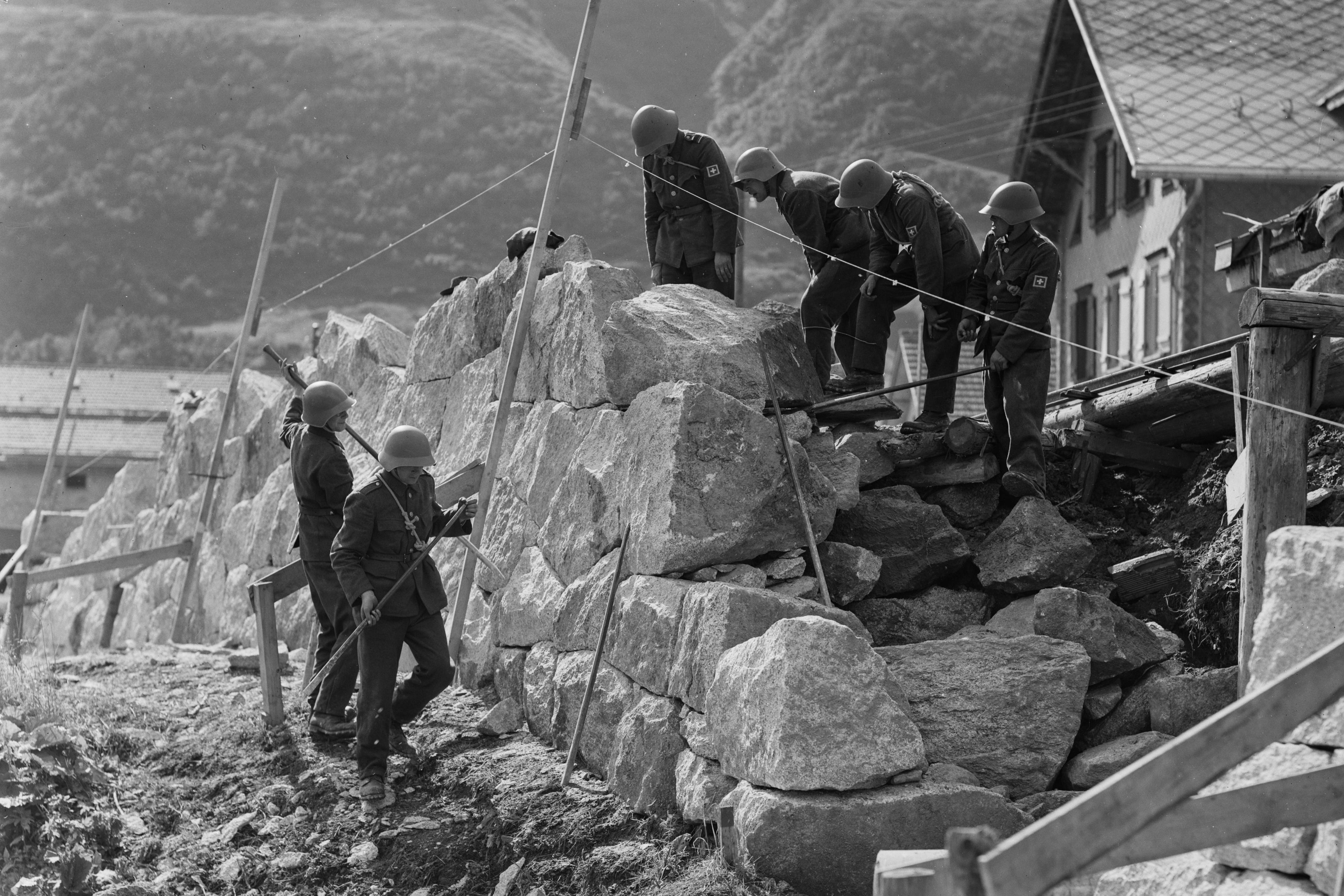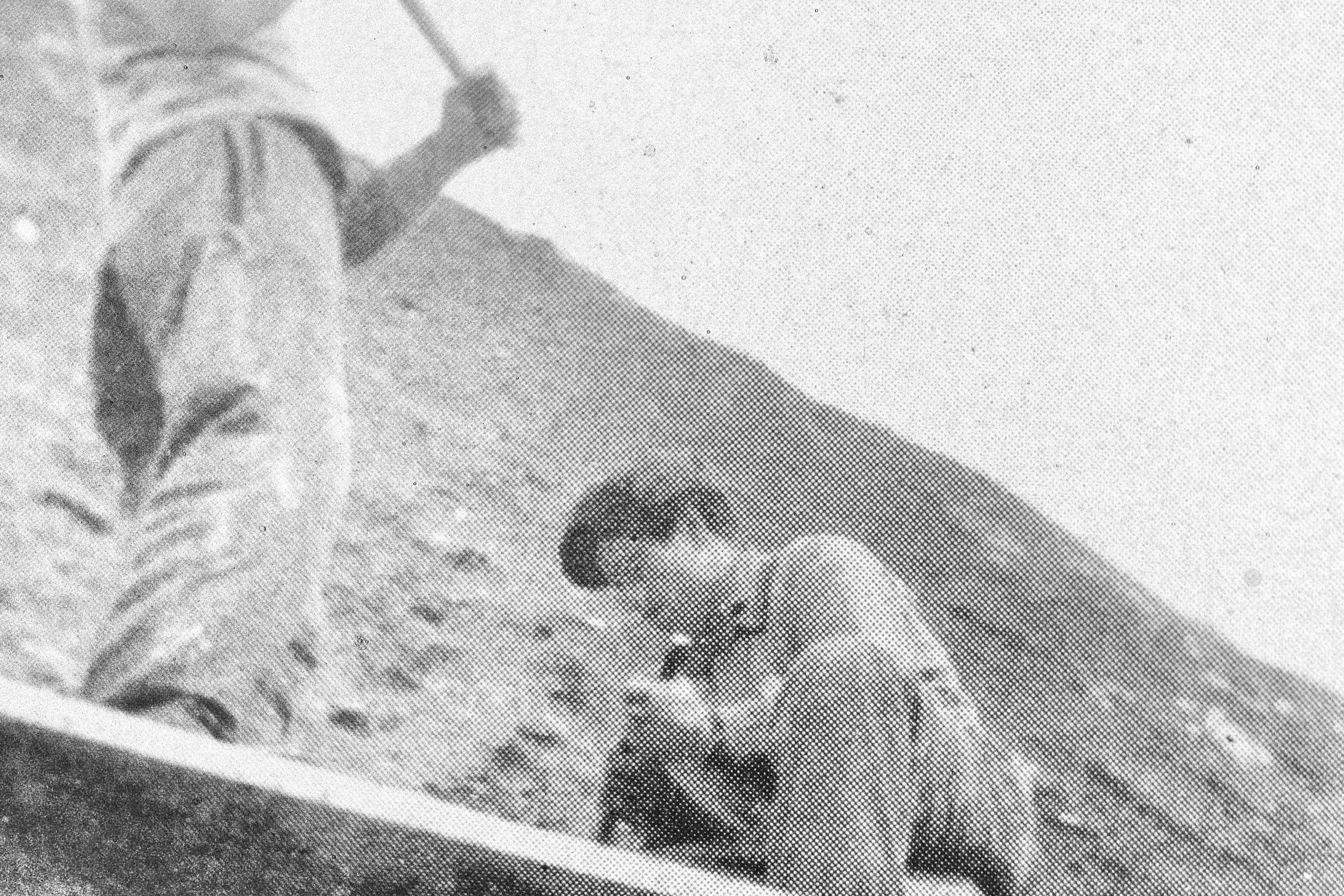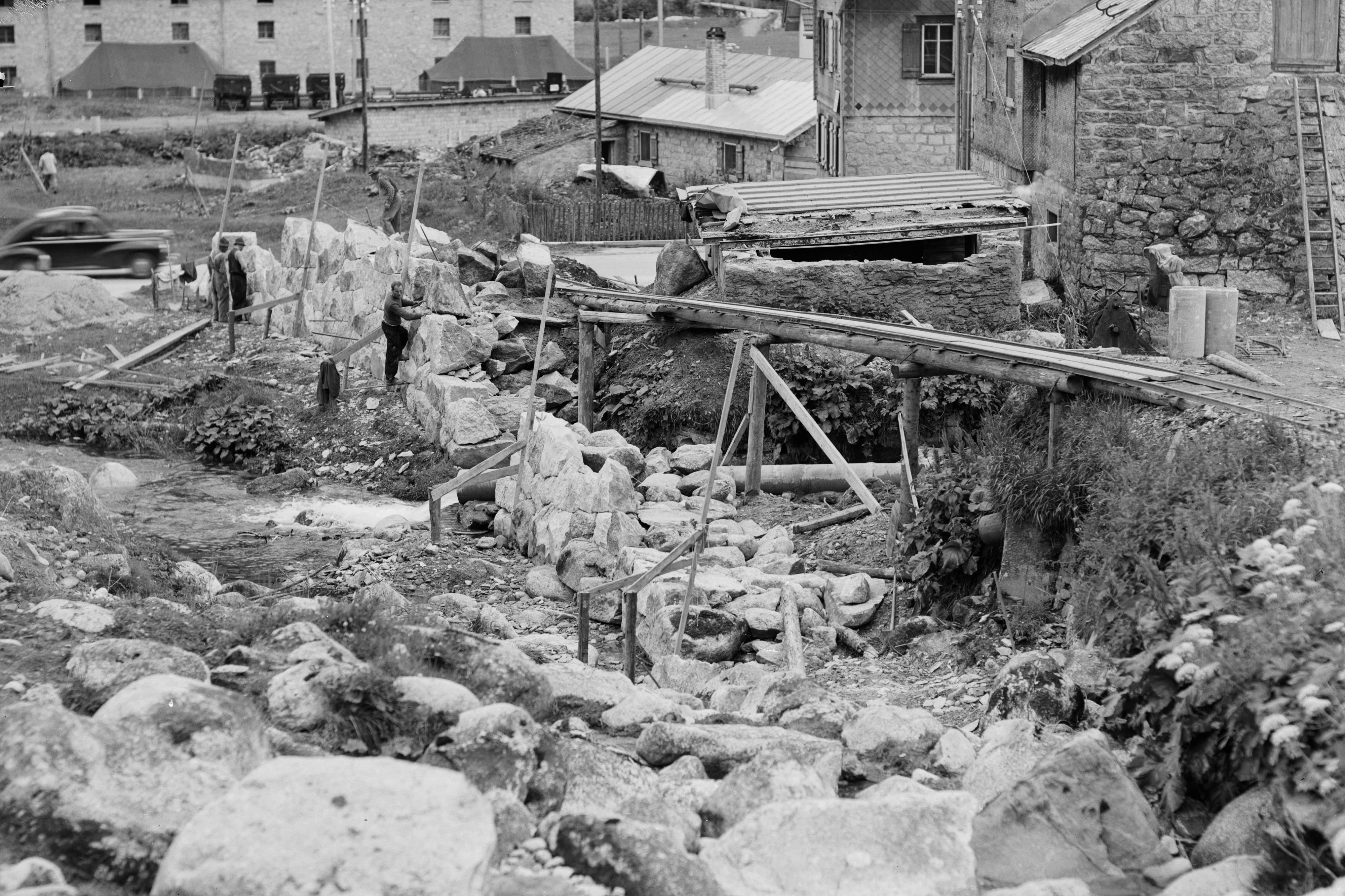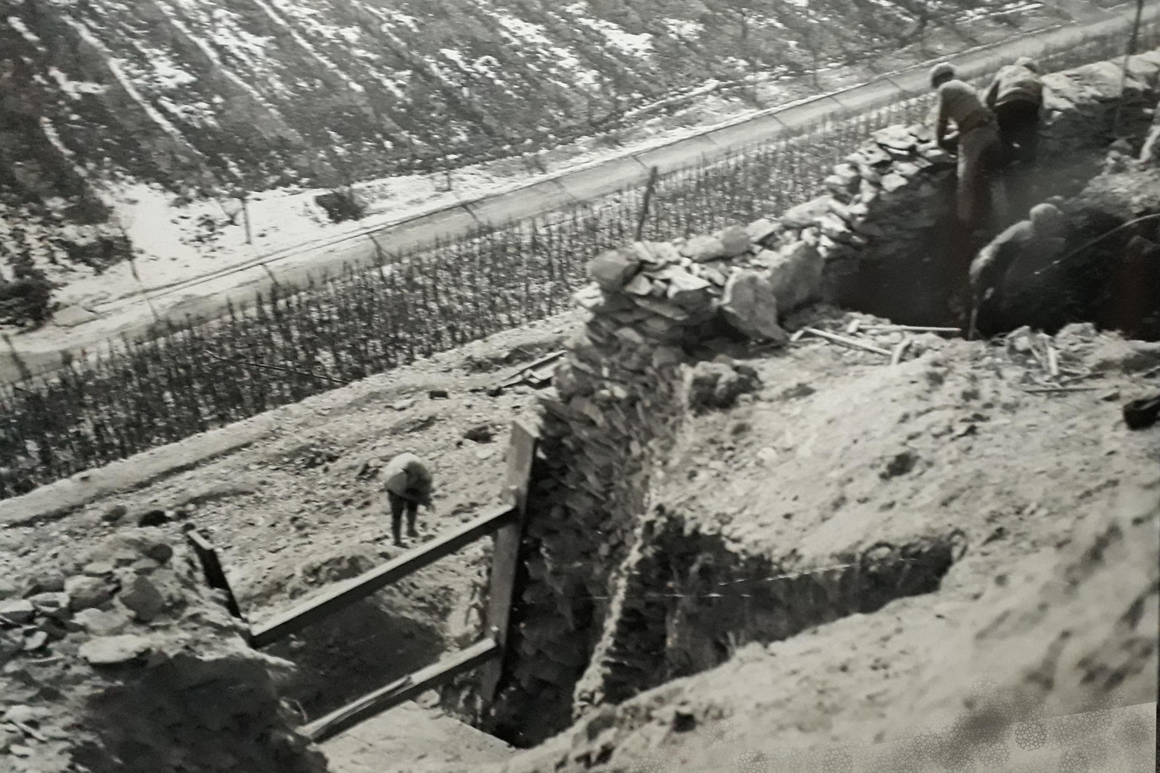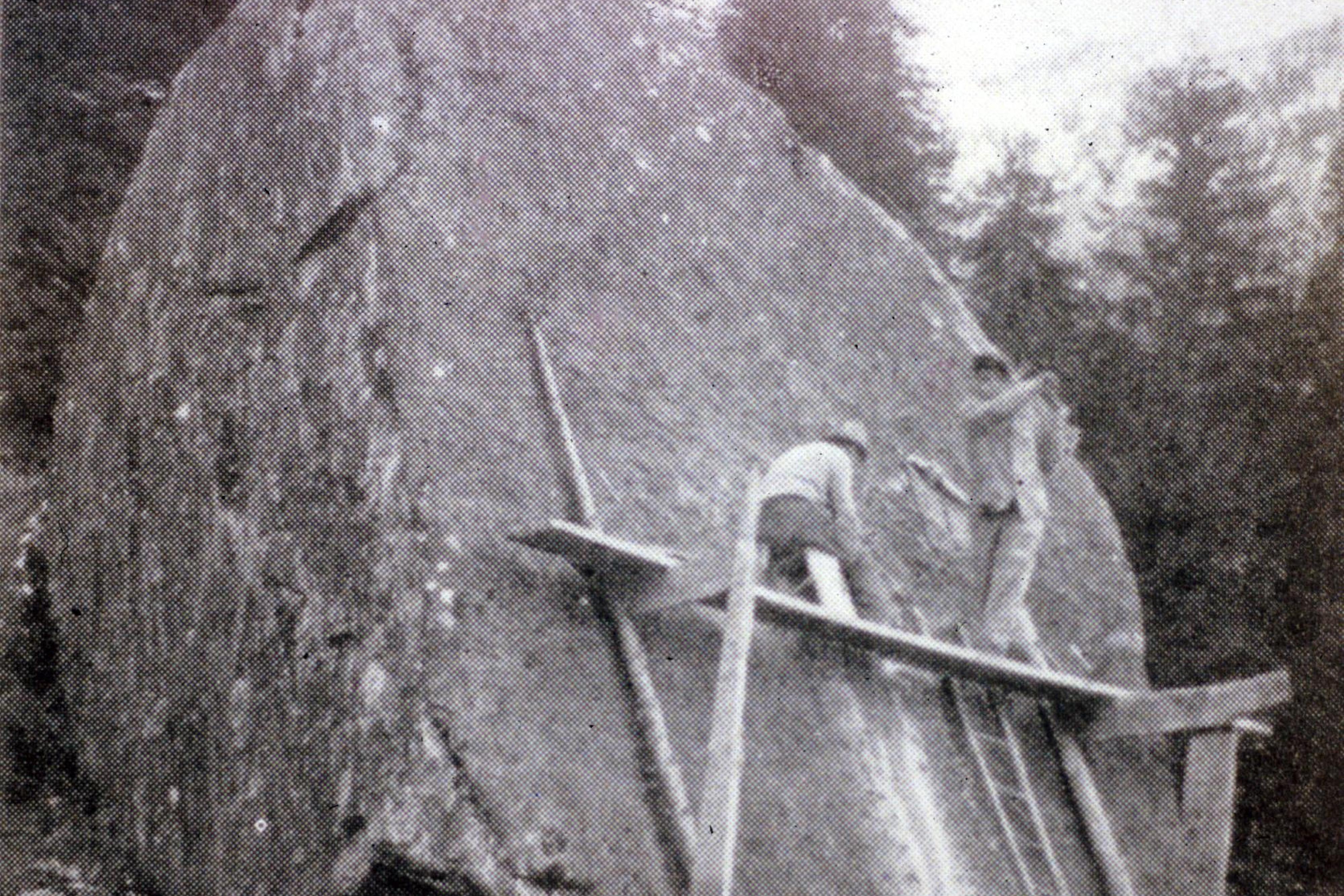 Preparing building stones in winter in the Swiss mountains. Drilling and shaping the stones by hand, transport of the blocks with a sledge.