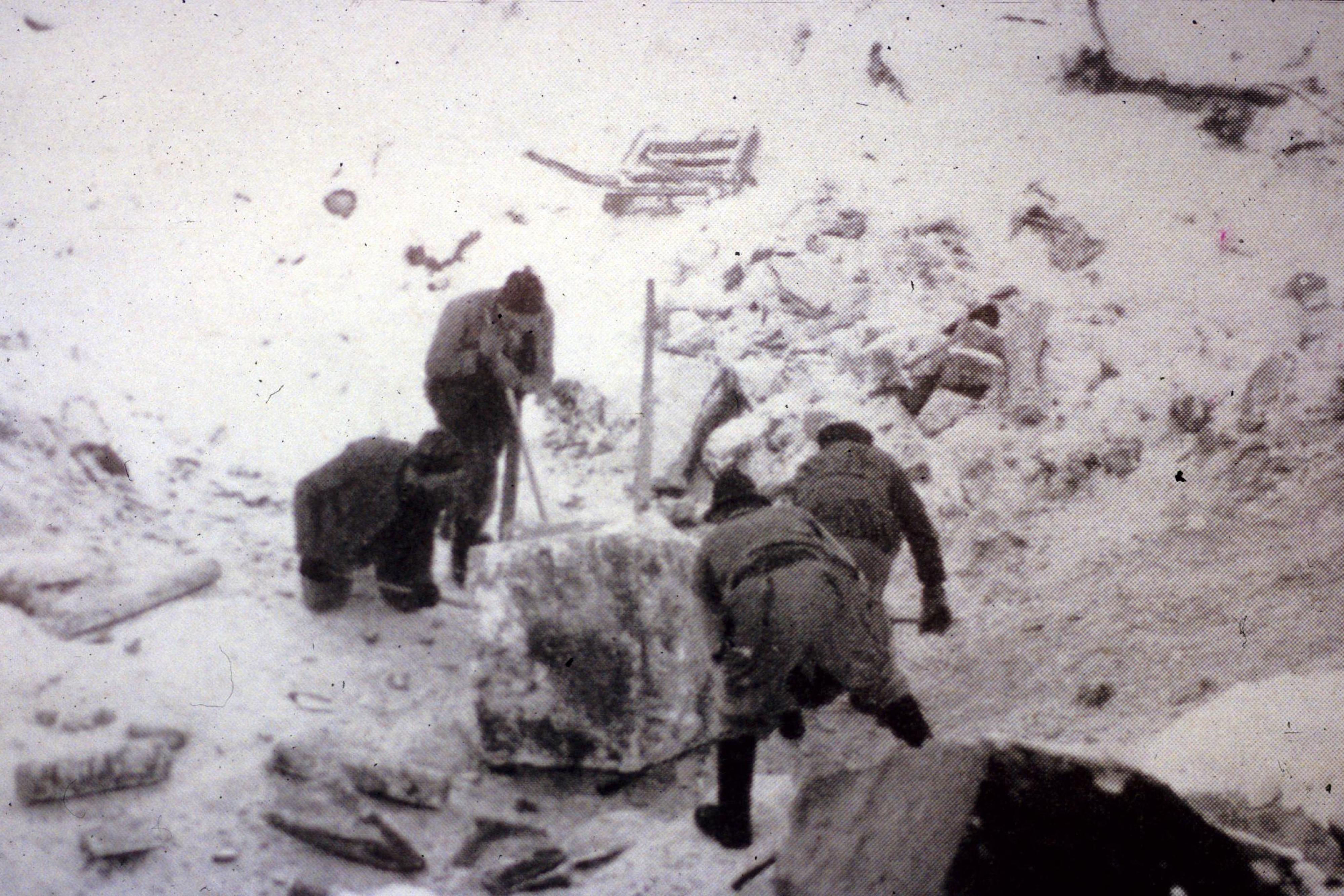 Vorbereitung von Bausteinen im Winter in den Schweizer Bergen vor dem zweiten Weltkrieg. Bohren und Bearbeitung der Steine von Hand, Transport der Blöcke mit einem Schlitten.